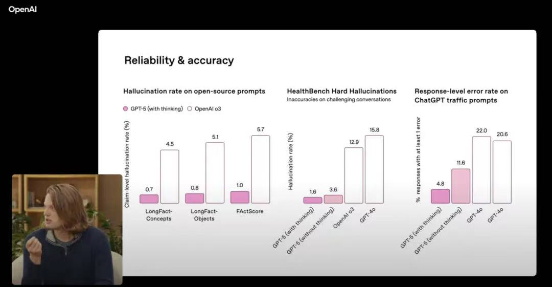 GPT-5在联网搜索、独立思考等方面的幻觉都好于前代模型。图片来源:OpenAI发布会。