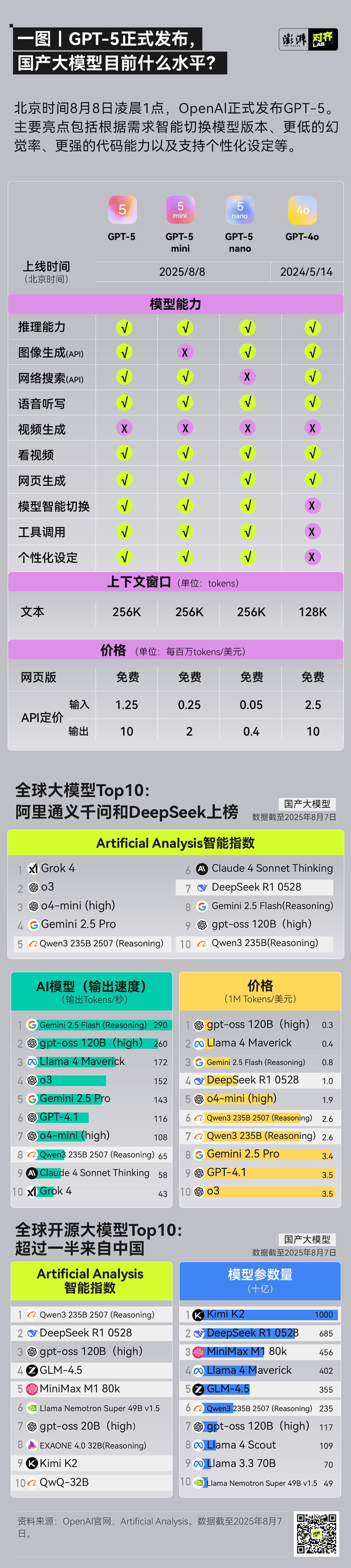北京时间8月8日凌晨1点,OpenAI正式发布GPT-5。GPT-5全系主要包括三种模型:GPT-5、GPT-5 mini和GPT-5 nano。与前代模型相比,GPT-5最突出的变化包括在编程、写作、健康问答场景的能力显著提升尚牛在线,更低的幻觉率、更强的代码能力。价格方面尚牛在线,网页端可免费使用GPT-5尚牛在线,三种模型的API调用价格均低于GPT-4o。